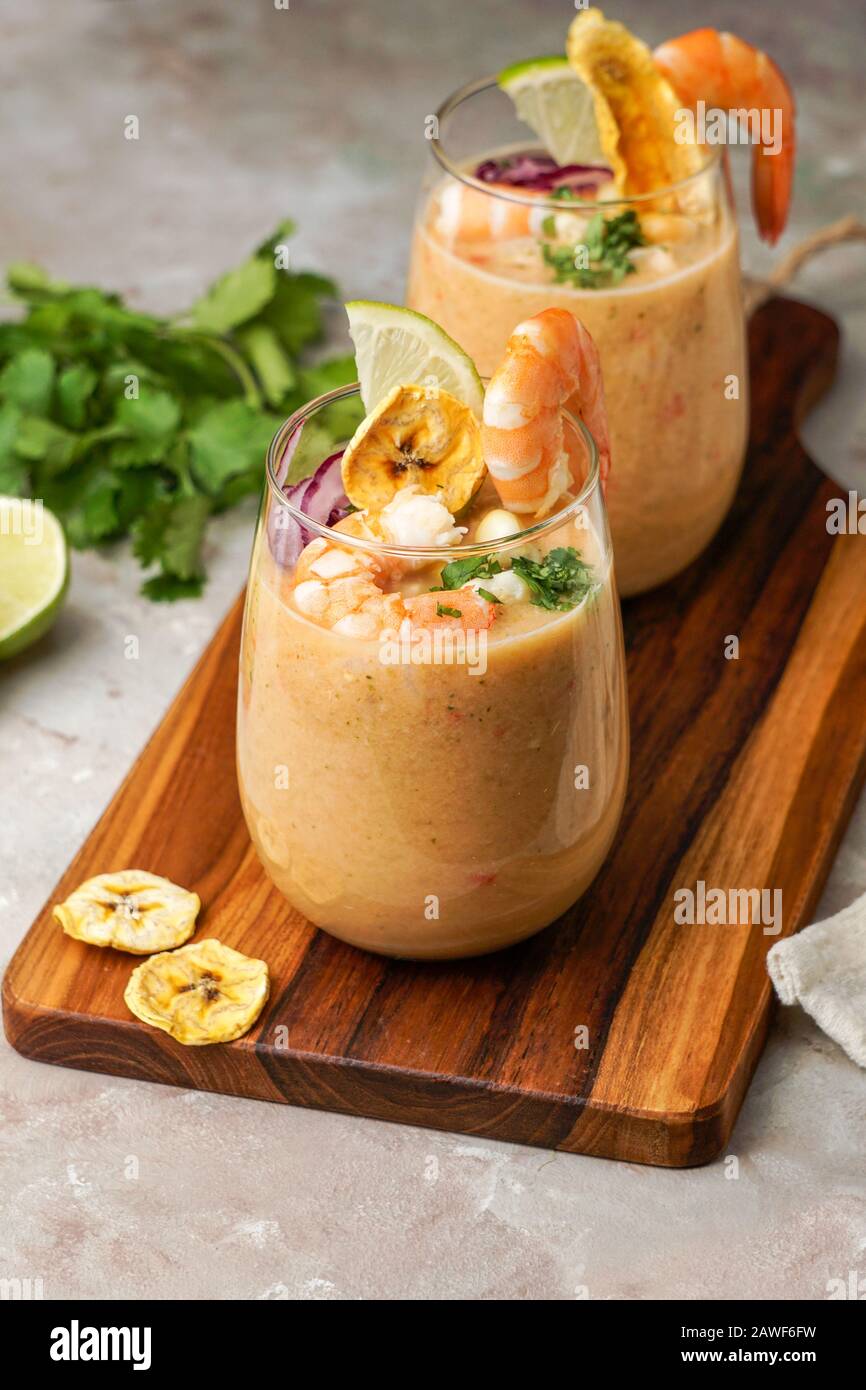 Premium Photo Leche De Tigre Peruvian Ecuador Latin American Food Raw Fish Cocktail Ceviche With Lime Aji Limon And Cilantro Traditional Peruvian Food With Srimps And Banana Chips